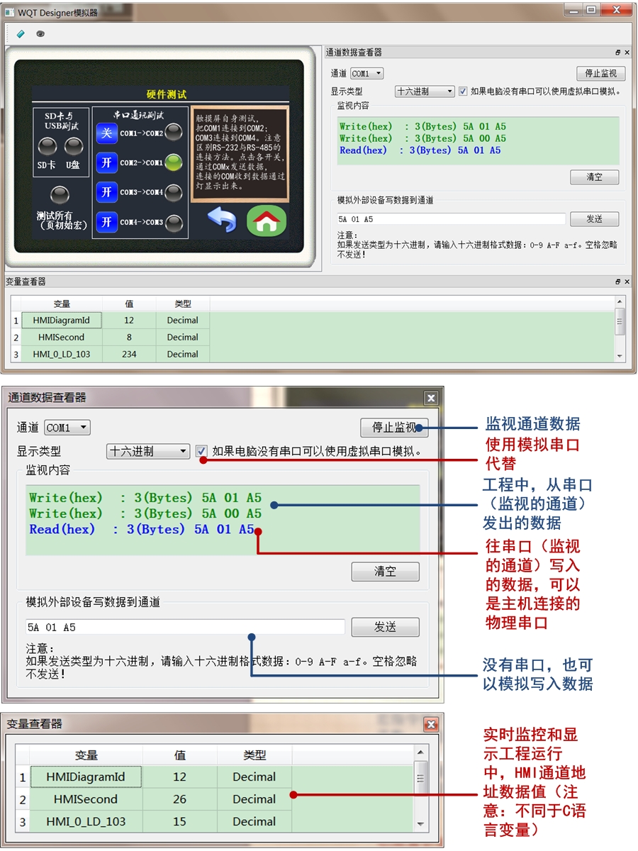 WQT Designer 具有強(qiáng)大的模擬仿真功能,PC端的模擬器,也相當(dāng)于一個(gè)PC版本的人機(jī)界面,搭配PC機(jī)物理串口,也可操作PLC、串口模塊等。使用串口的組態(tài)功能時(shí),用戶甚至不需要購(gòu)買觸摸屏,利用PC機(jī)模擬器,也可將工程先做完,再買觸摸屏設(shè)備。