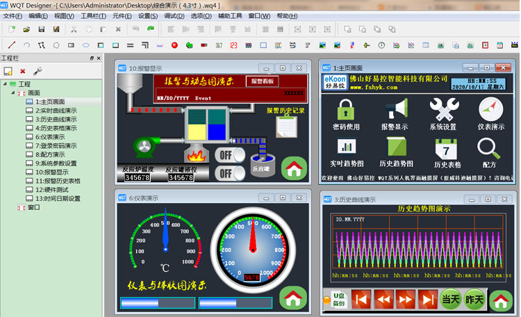 WQT Designer 具有強(qiáng)大的模擬仿真功能,PC端的模擬器,也相當(dāng)于一個(gè)PC版本的人機(jī)界面,搭配PC機(jī)物理串口,也可操作PLC、串口模塊等。使用串口的組態(tài)功能時(shí),用戶甚至不需要購(gòu)買觸摸屏,利用PC機(jī)模擬器,也可將工程先做完,再買觸摸屏設(shè)備。
